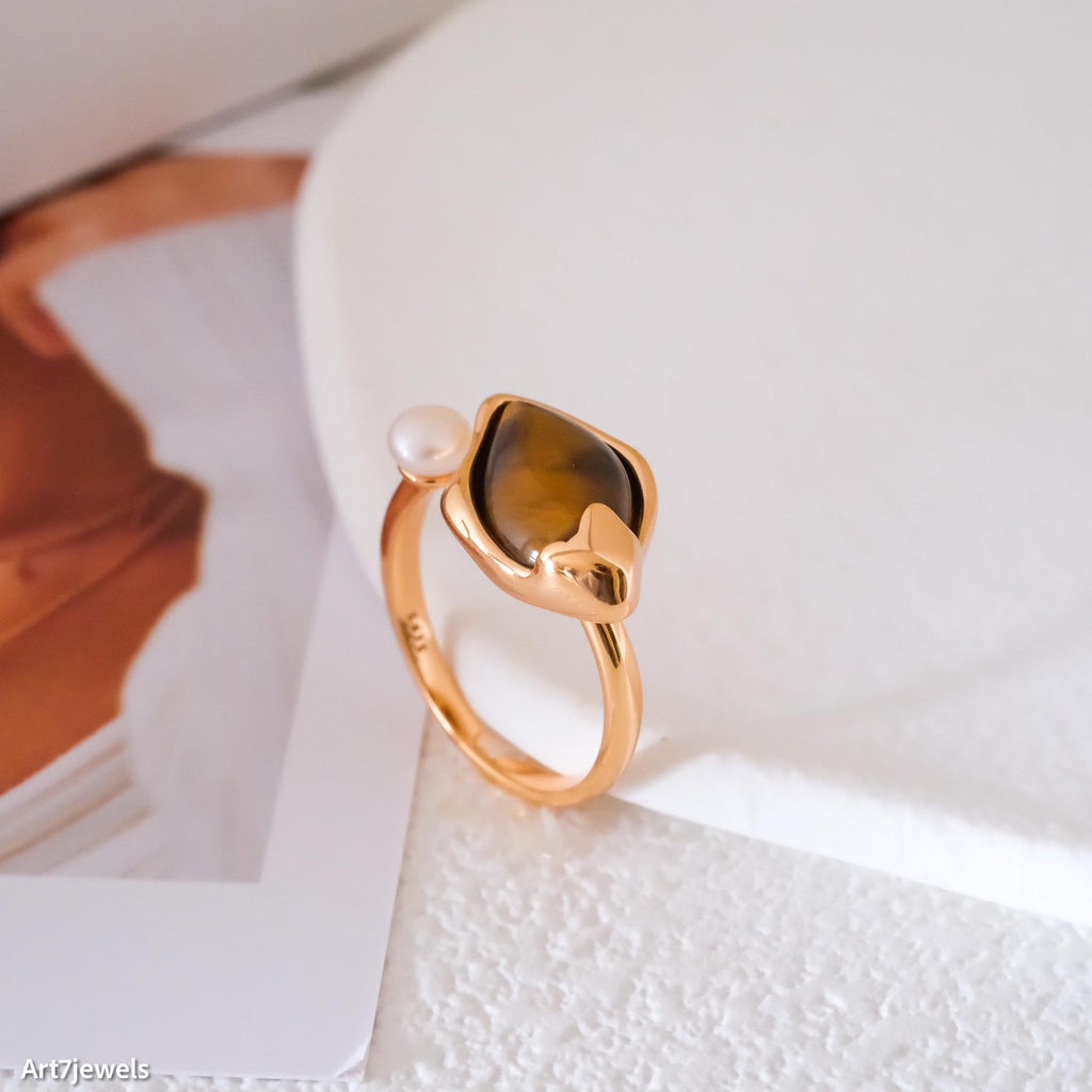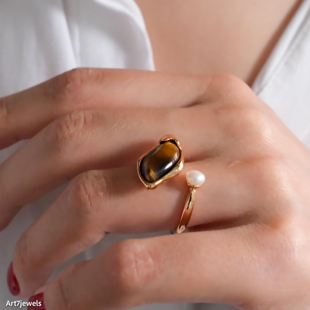 This beautiful adjustable open ring features a natural Tiger’s Eye stone in an elegant leaf-shaped gold bezel paired with a delicate white pearl, creating a unique and eye-catching statement piece. Handmade with high-quality materials, this open band ring is fully adjustable, making it perfect for everyday wear and an ideal gift for her. The warm golden-brown Tiger’s Eye crystal is known for its grounding and protective energy, making this ring not only stylish but also meaningful. Perfect for lovers of boho jewelry, gemstone rings, healing crystal jewelry, gold rings, tigers eye jewelry, and unique statement accessories.