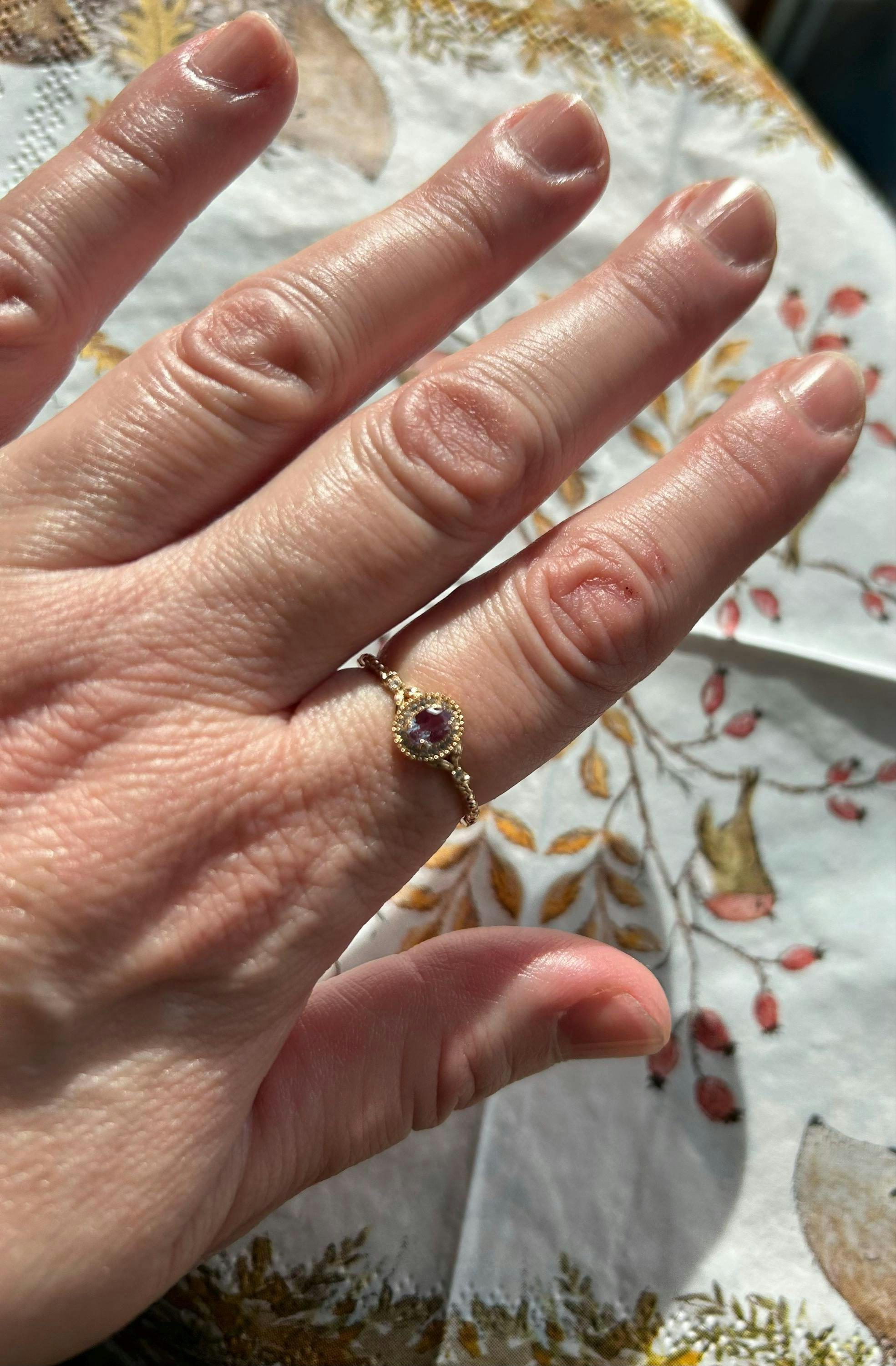Dainty Alexandrite Ring features a genuine oval-shaped alexandrite stone, known for its mesmerizing color-changing properties. In daylight, it reveals a beautiful emerald green hue, while under incandescent light, it transforms into a rich reddish-purple. The minimalist design is crafted with care in either gold or silver, allowing the vibrant alexandrite to take center stage.