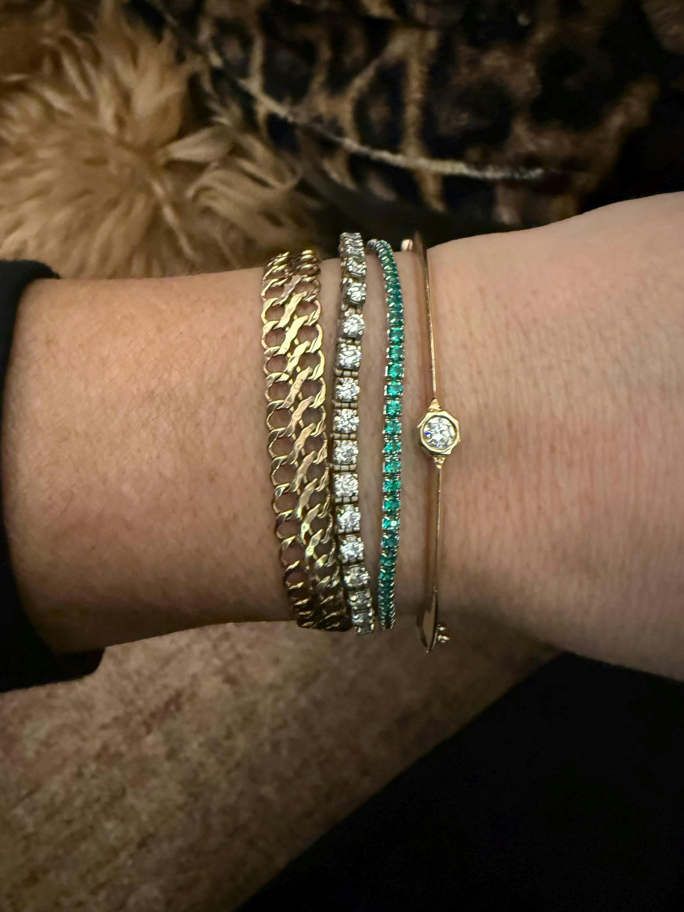 Emerald cz tennis bracelet, a must-have for any jewelry collection. This delicate 2mm thin bracelet is meticulously crafted from high-quality sterling silver and adorned with vibrant green emerald cz that catch the light beautifully. The classic tennis bracelet design ensures it can be worn alone for a subtle sparkle or stacked with other pieces for a more statement look. Perfect for both everyday wear and special occasions, this silver emerald bracelet adds a touch of sophistication and timeless charm. It makes an exceptional gift for her, whether for birthdays, anniversaries, or just to show appreciation. Elevate your style or surprise someone special with this exquisite piece that epitomizes elegance and grace.