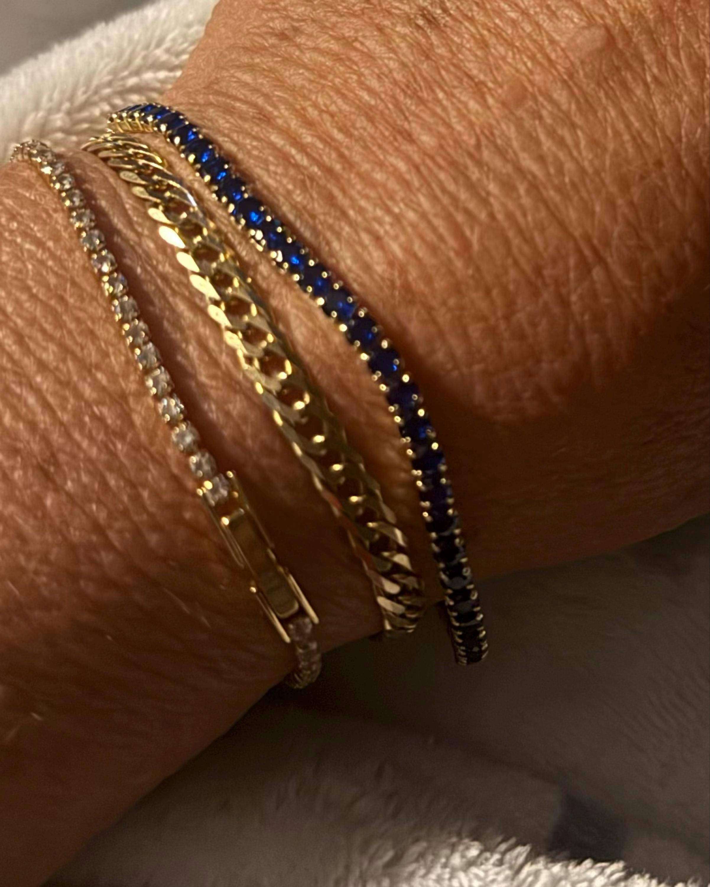 This elegant 14k gold plated sapphire tennis bracelet features sparkling 3mm blue sapphire CZ stones, set in a delicate yet durable design. Its minimalist style is perfect for both casual wear and formal occasions, making it a versatile addition to any jewelry collection. The bracelet is adjustable to fit comfortably and is suitable for both women and men. Whether as a gift for her or as a timeless unisex accessory, this dainty blue sapphire bracelet adds a touch of sophistication to any outfit. Ideal for birthdays, anniversaries, or just because.